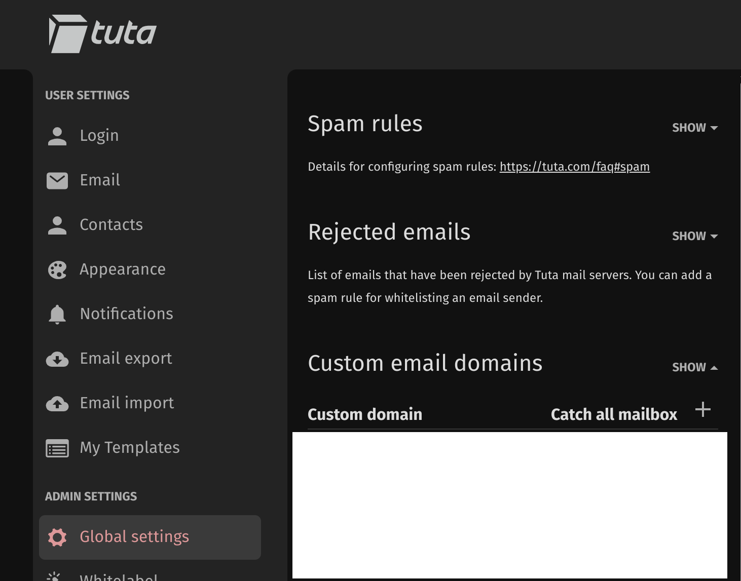 - First, go to Tuta.com and click the gear icon in the bottom left of the screen. Then, go to Admin Settings > Global settings > Custom email domains, and click "SHOW." Click the "+" icon to begin the process.