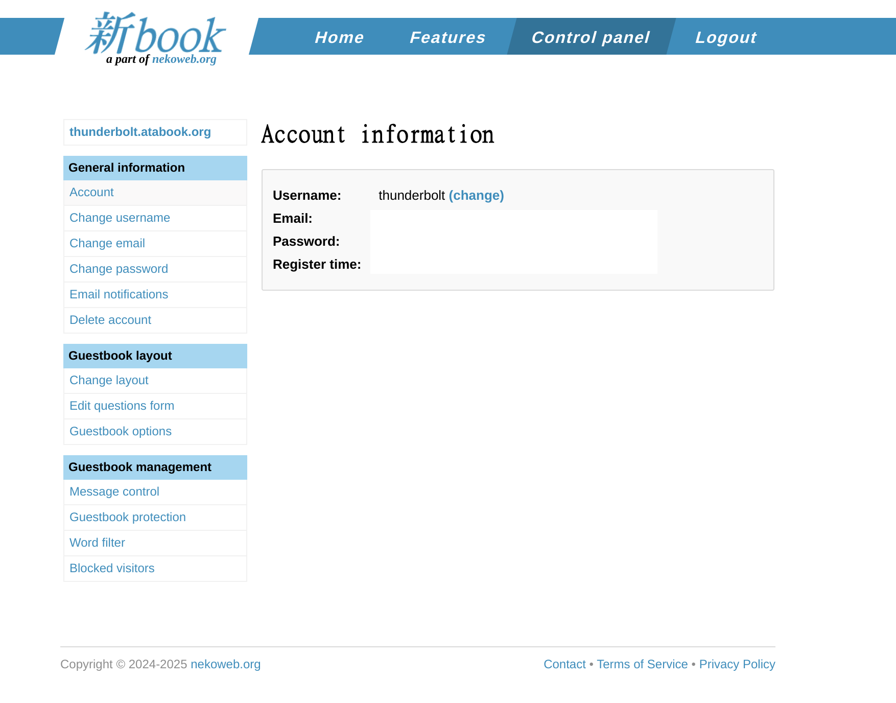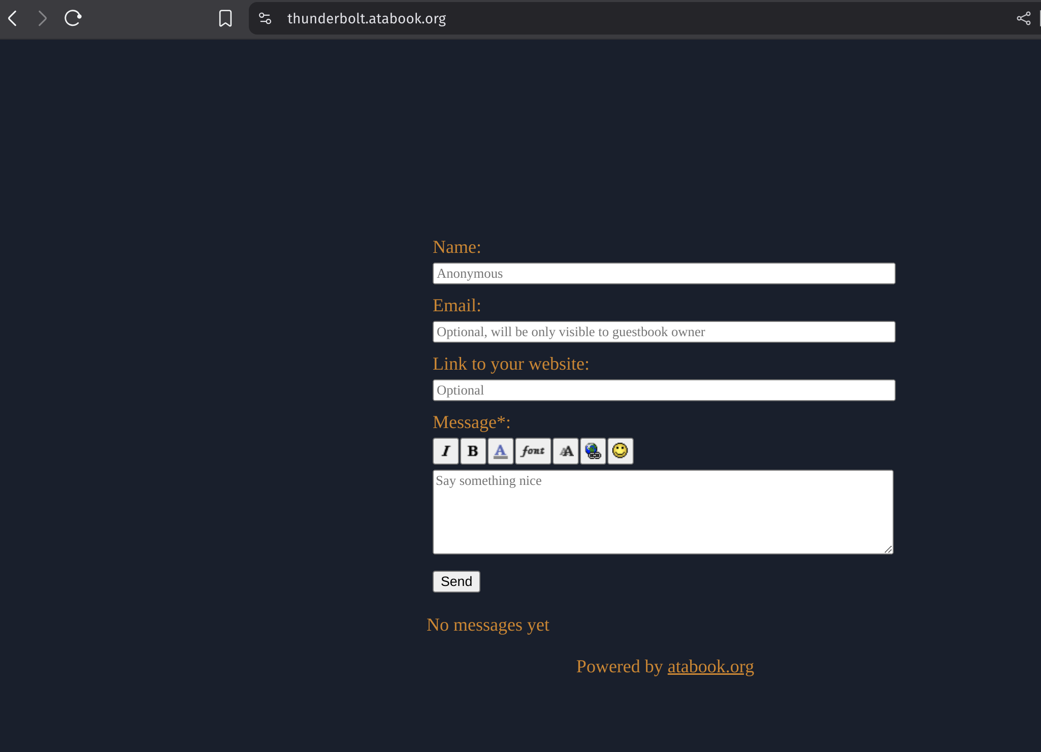 - First, register your Atabook account. Your username isn't super important, unless you want to link it within your website independently. I embed my guestbook with an inline frame (iframe), so the URL isn't visible. Nevertheless, I still made it a priority to grab "thunderbolt.atabook.org," just for ease of memorization.