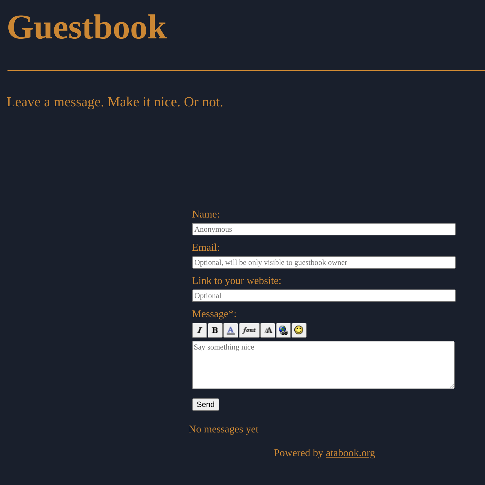 That's where I left my guestbook, but you're free to customize yours to your heart's contentment. - Once your guestbook has reached a satisfactory point of completion, you can visit it live at yourusername.atabook.org. Here's mine, with a screenshot to accompany it: