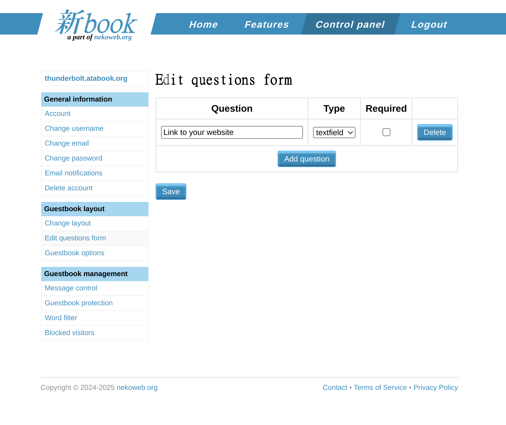 You might notice the section called "Logo image (URL)." This image isn't visible on my website; it's actually just a blank PNG stored in the Images directory. If I didn't put this blank logo, Atabook would default to using its own logo, which to me, was distracting. Still, if you click on the blank PNG, it's linked to Atabook.org, and the link can't be changed. You can even try it for yourself—just click on the blank space right above the "Name" box. - Now, you also might notice that I've created a "Link to your website" box that isn't available on the default template. To create custom questions like this one, go to Guestbook layout > Edit questions form. You should see something like this: