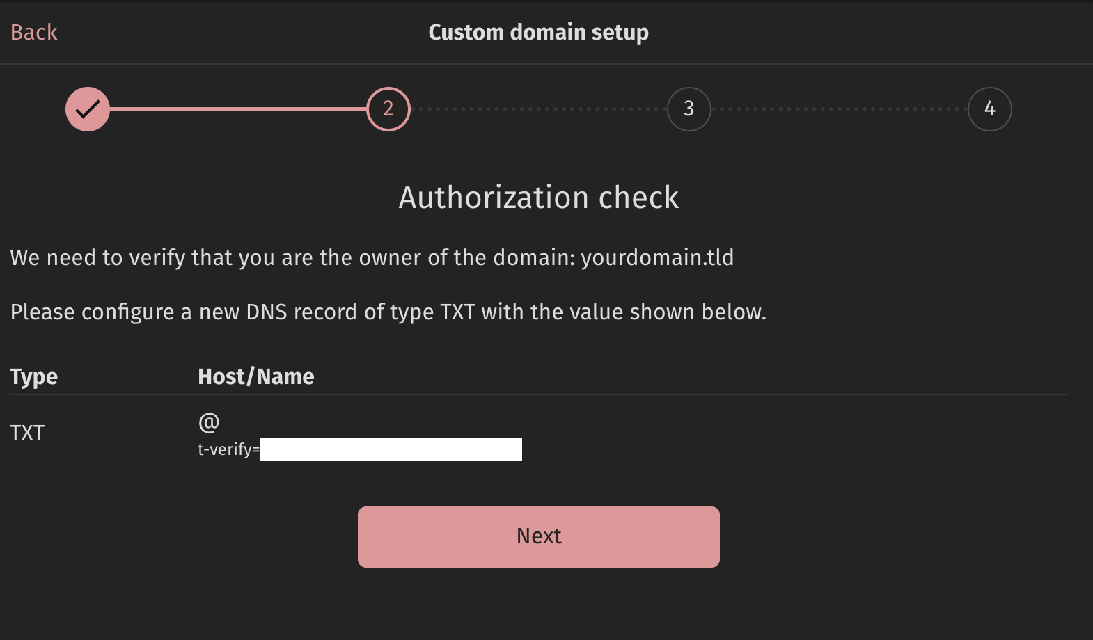 - Tuta will issue an authorization check. This basically means that they have to verify that this domain actually belongs to you. To do so, they're asking you to add a unique text, or TXT record, to your zone file.