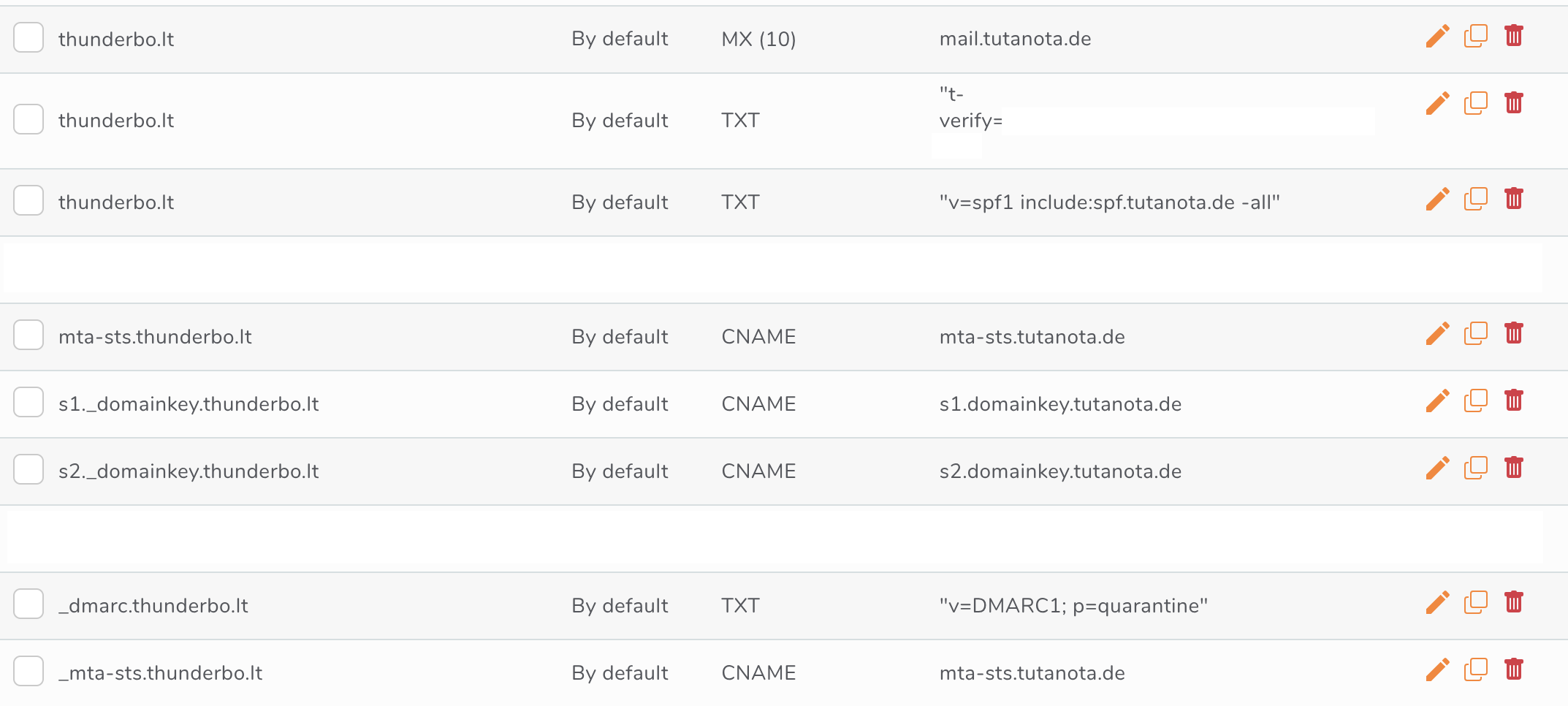 Be aware that it may take a few minutes or even hours (though I've never had to wait that long) for the DNS records to update, so don't be discourage if, after clicking "Next," Tuta throws up an error that says something along the lines of "DNS lookup failed." - Once the DNS lookup succeeds, Tuta will show you another list of records that you have to create in your zone file. These are the same for all domains pointing toward Tuta mailservers: