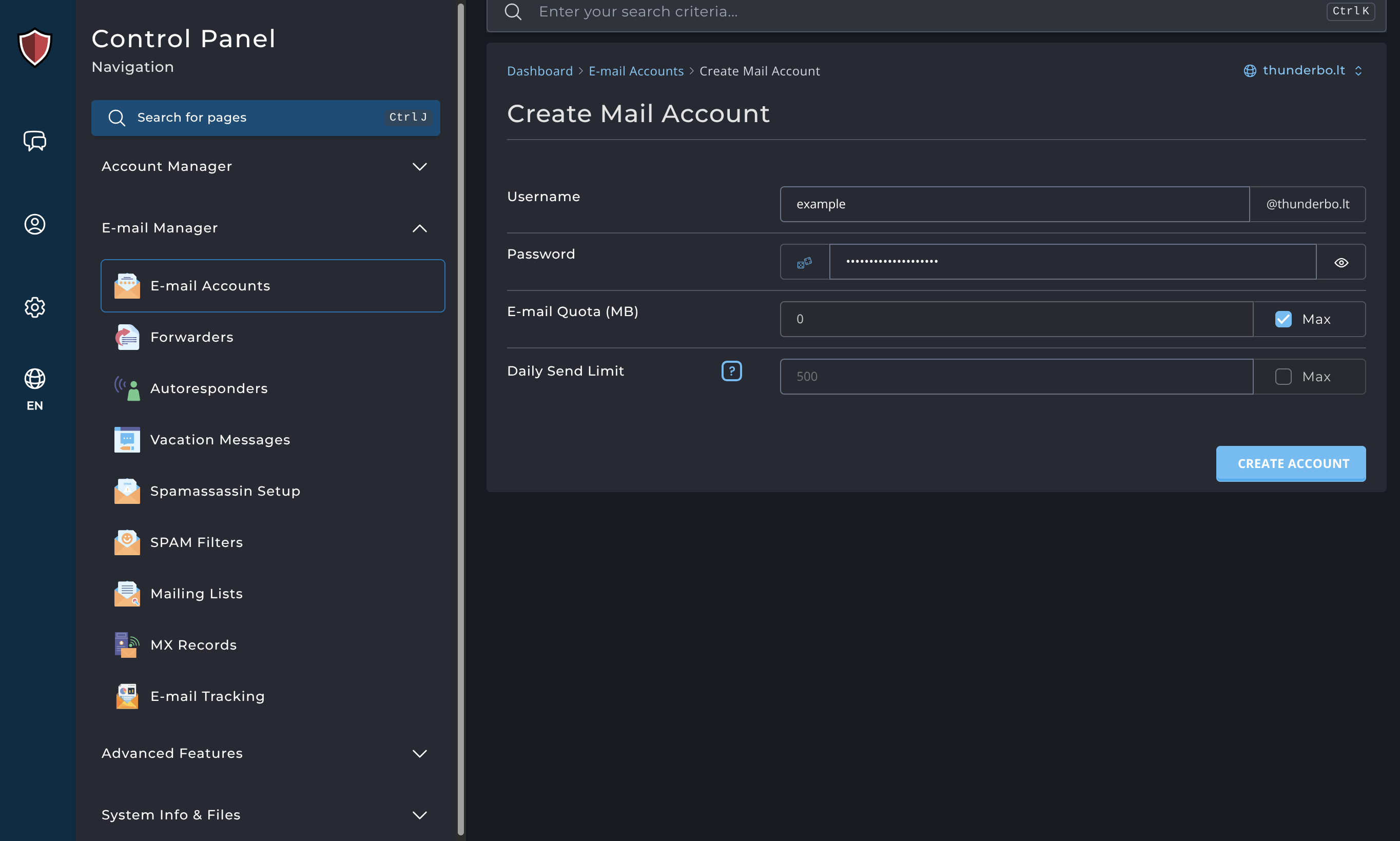 - First, log into DirectAdmin and go to E-mail Manager > E-mail Accounts. Then, click "+ CREATE ACCOUNT" and create a username. We'll use example again. You can choose to create your own password, or have DirectAdmin generate one for you. Since we're working on the asusmption that you're the only person who's going to be accessing this DirectAdmin account, check "Max" on "Email Quota" (MB)." Then, click "CREATE ACCOUNT."