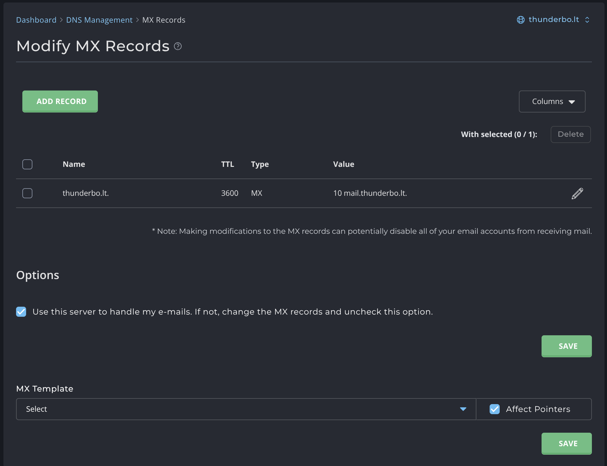 The POP/IMAP Server and SMTP Server will only be relevant if you intend to use an email client. Since we're sticking to webmail for this tutorial, you don't have to worry about anything except your username and password. - Now, go to E-mail Manager > MX Records. You should see this: