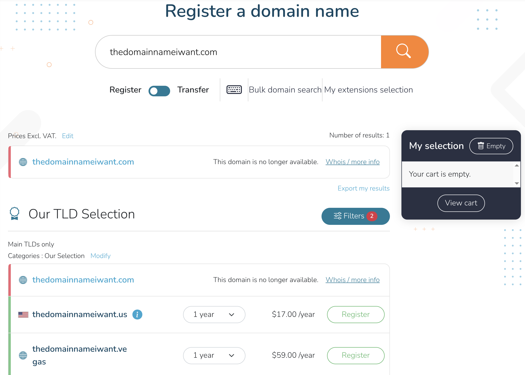 As you can see in the image above, there is a chance that the domain name you want is not available, at least in the TLD (Top Level Domain, such as .com or .net) that you want.
