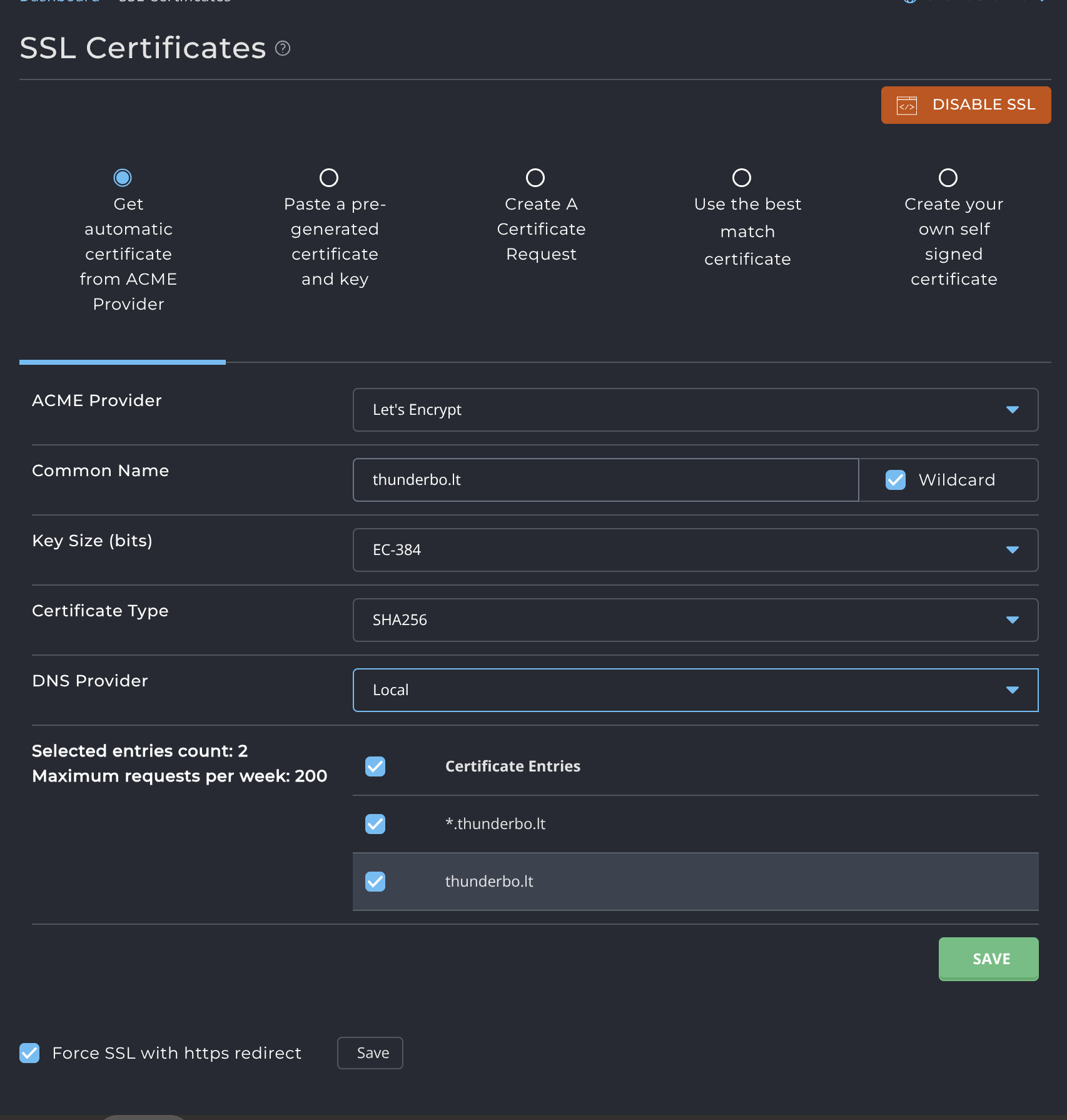 - Go back into DirectAdmin Account Manager > Domain Setup, and this time choose SSL Certificates. Check "Get automatic certificate from ACME provider," and leave all options on default. Check "Wildcard," which should automatically select yourdomain.tld and www.yourdomain.tld (in my case, thunderbo.lt and www.thunderbo.lt). Also check "Force SSL with https redirect," and then click "SAVE."