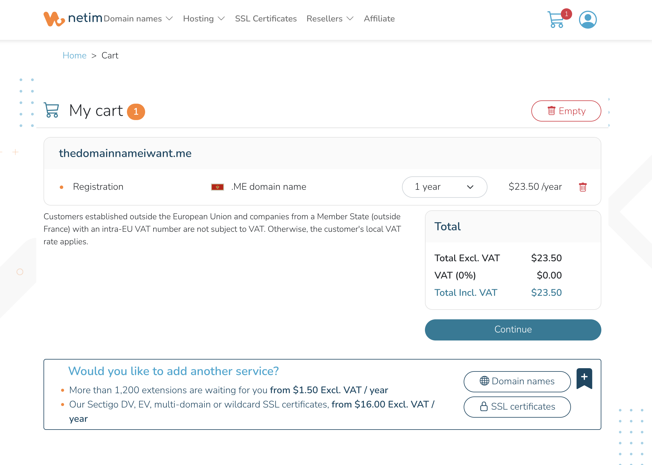 The TLD for this website is .lt, the ccTLD (country code Top Level Domain) for Lithuania. (Using a TLD to make a word, such as combining "thunderbo" and ".lt" to make "thunderbo.lt" is called a "domain hack" by the way.) - Now, head over to check out. Do not add any other services, as domain registrars will try to upsell you on everything from SSL certificates (which you can get for free) to web hosting (which you can get for a better price or with better resources elsewhere).