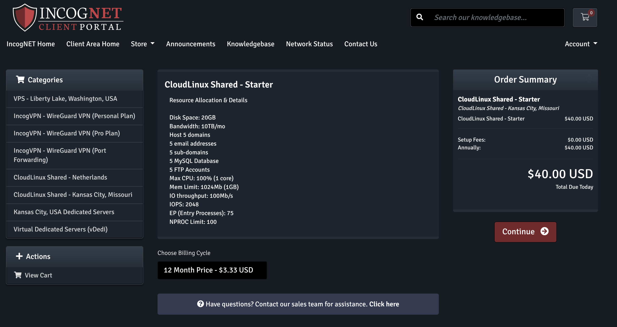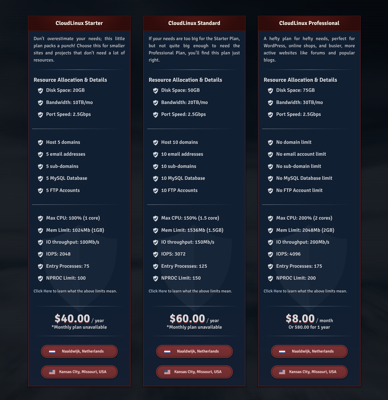 - First, go to IncogNET's shared hosting plans. As of April 2025, you'll see three plans to choose from: Starter, Standard, and Professional. For most personal websites, the Starter plan is more than enough; a 20 GB disk is plenty of room to play around with. But if you anticipate significant growth in traffic, content volume, or domains you wish to host, it might be worth it to choose the Standard or Professional plan. You'll also notice two locations to choose from: Kansas City, Missouri, USA, and Naaldwijk, Netherlands. The location doesn't really matter much, but if your audience is primarily in the United States or broader North America, Kansas City is the better pick, while if your audience is in or near Europe, you might want to choose Naaldwijk. Since IncogNET's hardware is physically located in these advertised jurisdictions, it's also worth considering that your site and its contents will be protected by the First Amendment if you choose a location within the United States; not so for the Netherlands. For the sake of this tutorial, let's go ahead with the Starter plan in Kansas City.