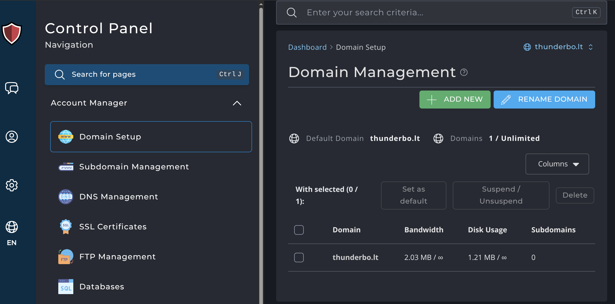 - Now that you've logged in, the first thing you'll want to do is add your domain. Go to Account Manager > Domain Setup > + ADD NEW. Enter your domain and click "CREATE." Leave all settings as default. You should now see something like this: