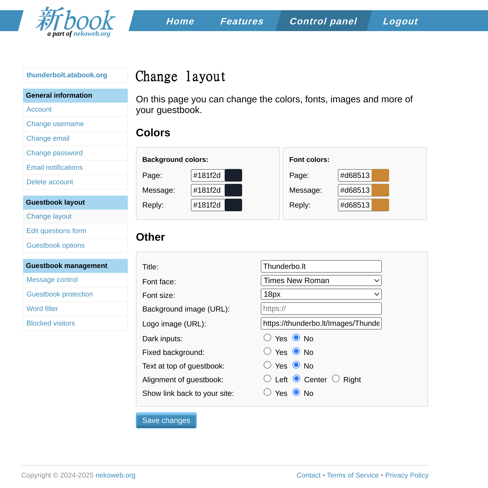 For the remainder of this section of the tutorial, I'm going to be working within my existing Atabook account. After I've logged in, I see this: - The highest priority is to go to Guestbook layout > Change layout. I've already made my own changes here, and the categories are pretty self-explanatory, but I'll lay them out here so that they're easy to replicate: