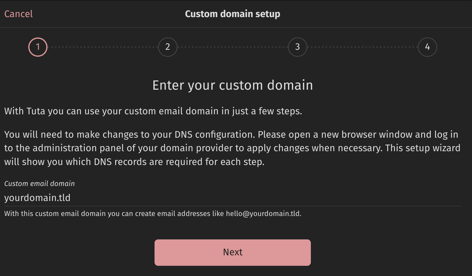 Be aware that it may take a few minutes or even hours (though I've never had to wait that long) for the DNS records to update, so don't be discourage if, after clicking "Next," Tuta throws up an error that says something along the lines of "DNS lookup failed." - Once the DNS lookup succeeds, Tuta will show you another list of records that you have to create in your zone file. These are the same for all domains pointing toward Tuta mailservers: