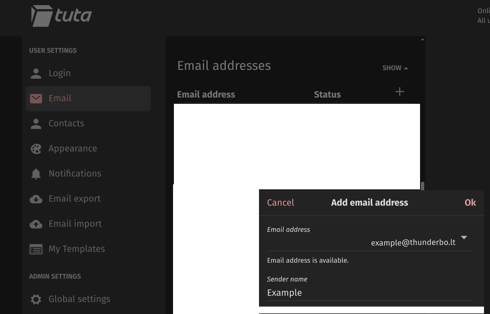 - First, go to Tuta.com and click the gear icon in the bottom left of the screen. Then, go to Admin Settings > Global settings > Custom email domains, and click "SHOW." Click the "+" icon to begin the process.